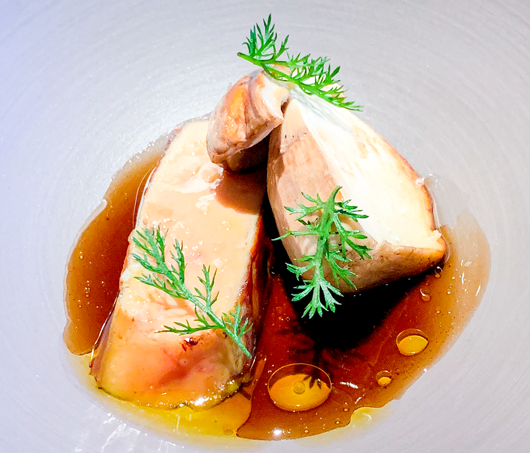 „Cépes“ Pilze aus dem Piemont, gegrillte Gänseleber vom „Maison Mitteault“, Pilzconsommé