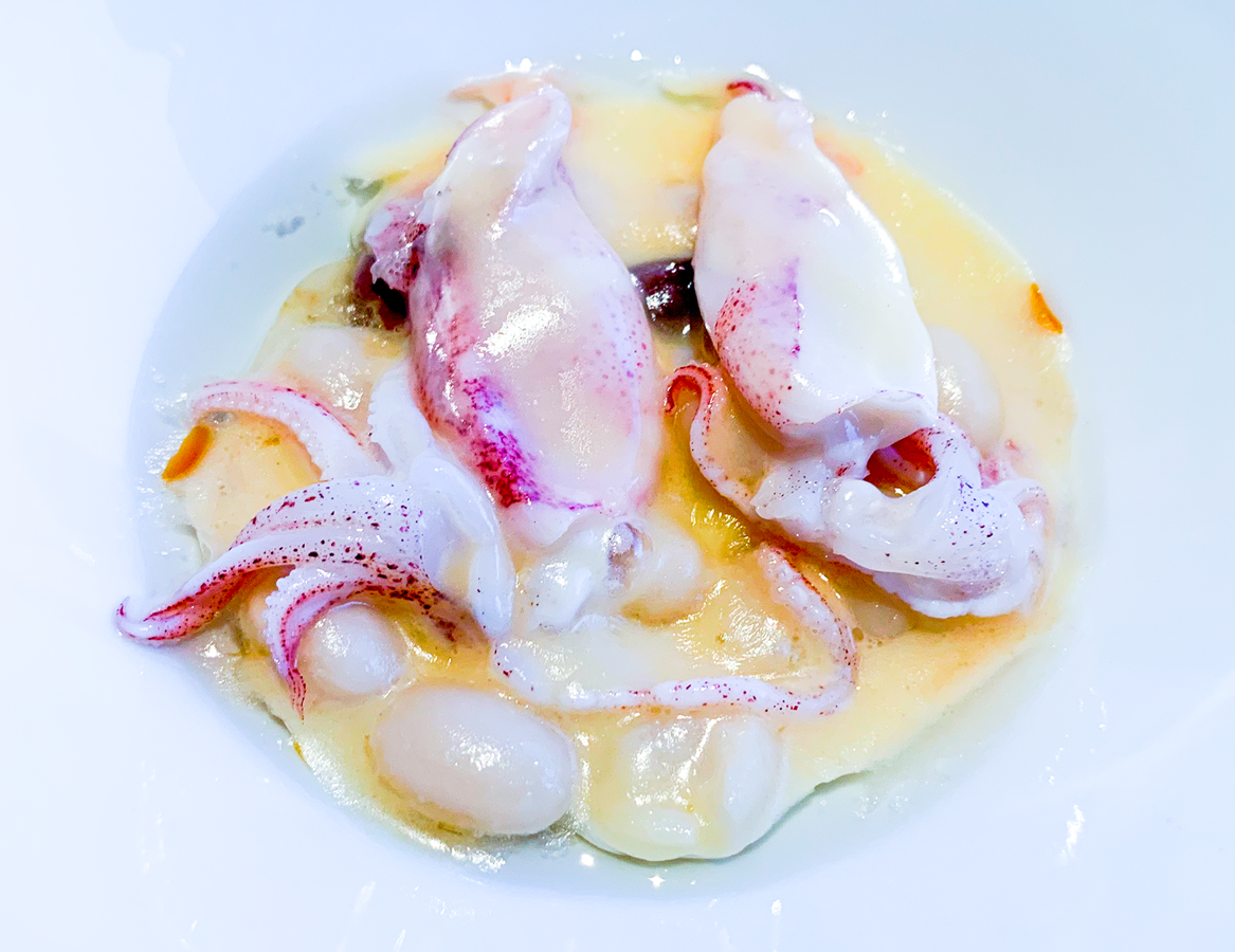 Ragout von Kakaobohnen aus Pigna, Baby Tintenfisch, weißer Sesam