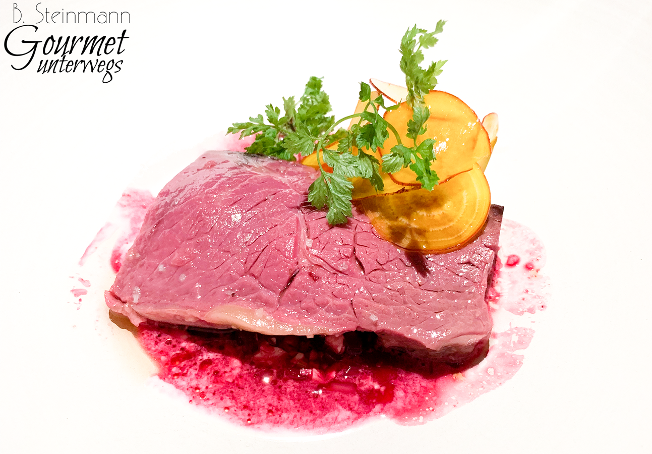 Rinderrippe, 48 Tage gereift, Rote-Bete-Saft, frische Mandeln