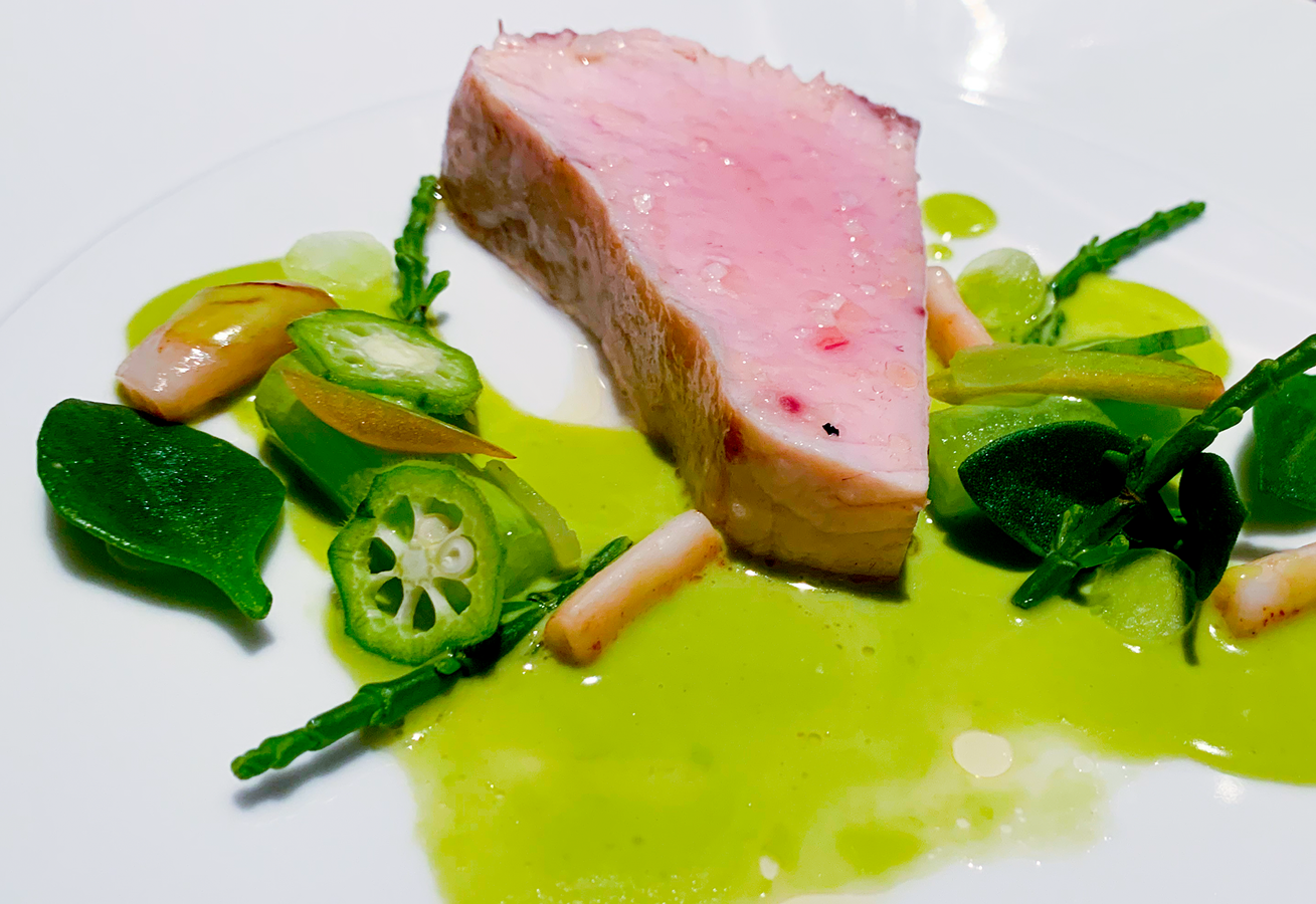 Nun ihr lieben Vielfraße, das ist kein Kasseler Rippchen, das ist ein Teil vom Schwertfisch. Der salzige Fisch wird von Queller und Plankton begleitet.