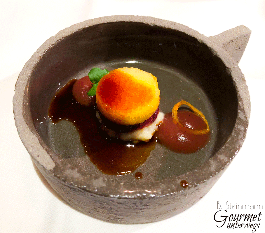 Diese schickte als Amuse Bouche eine Wildschweinblutwurst mit einem tollen Bratapfelsud, begleitet von einem Kartoffeltaler. So etwas wie „Himmel und Ääd“, das ich immer für einen Klassiker aus dem Rheinland hielt.