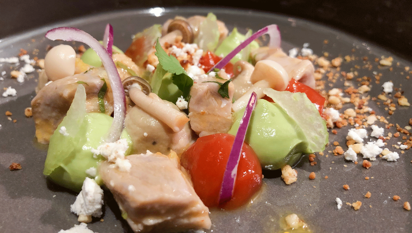 Passionsfrucht, Buchenpilz, Mandelcrunch, Avocadocreme, scharfes Tomatengel