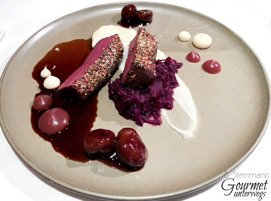 Nicht nur sehr würzig sondern insgesamt eine aromatisch sehr breit angelegte Kreation. Rotkraut, Sellerie, Maronen und Portwein-Apfelkompott begleiteten den Rehrücken mit allem was man so braucht. Kaum vorstellbar, dass der Teller ohne den fantastischen Gewürzsud ausgekommen wäre.