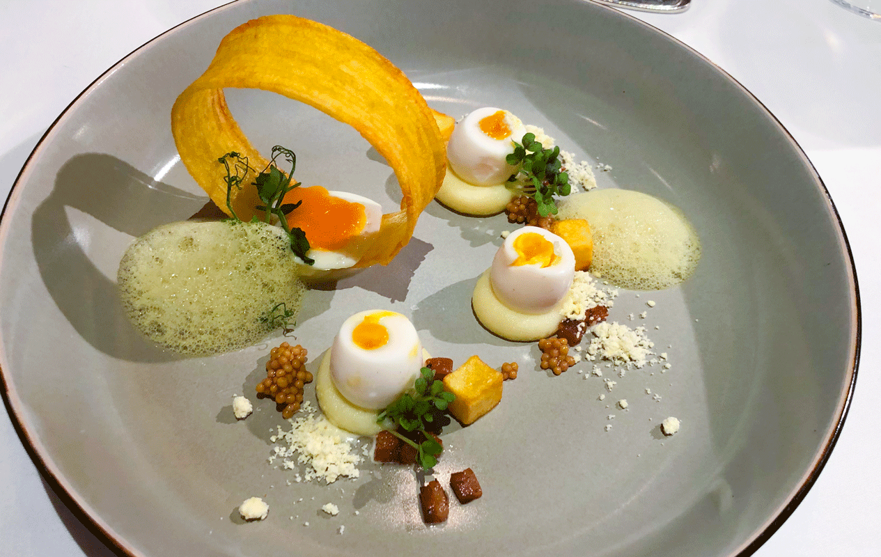 Wow, eine wunderbare Idee wurde kraftvoll und aromatisch umgesetzt. Die Küche zeigt, dass sie ihr Handwerk versteht. Senfsaat, Senfsauce und Kartoffeln in verschiedenen Texturen, mehr geht wohl kaum.