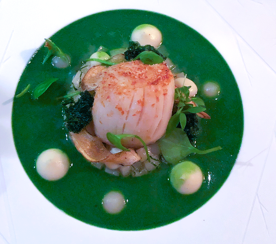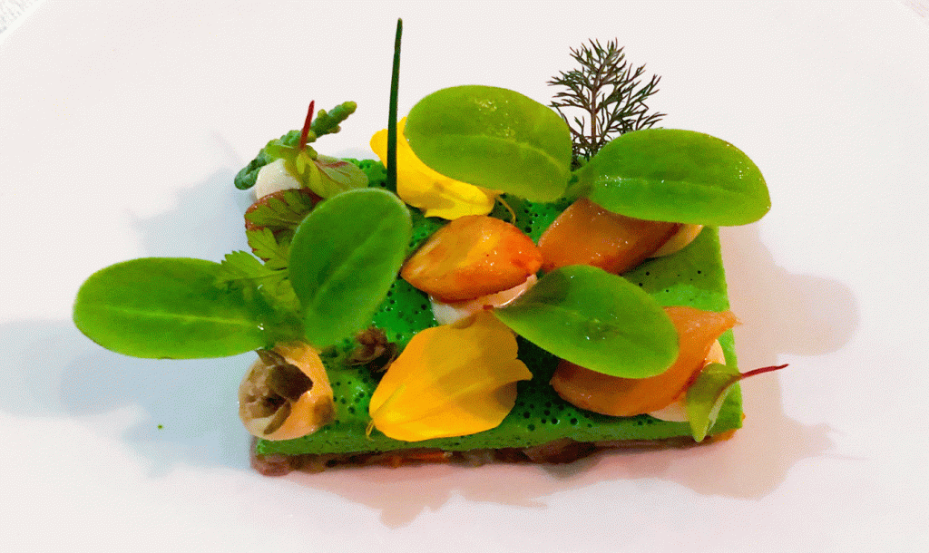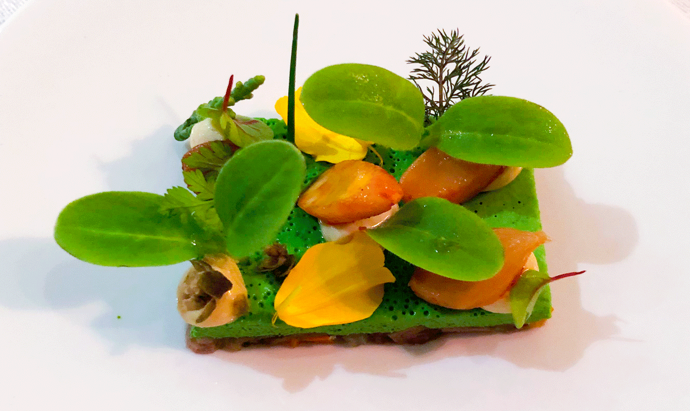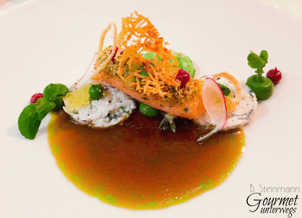 Die Feuchtigkeit und Schatten liebende Bachkresse kommt als Creme und Blattspitzen zum Einsatz. Hinzu kommt ein Gurkenrelish mit Senfsaat und Senfgurke, etwas Rettichsalat und Hagebuttencoulis/Hagebuttenconfit. Gedörrter Wildschinken und ein Röstzwiebelsud runden das Gericht ab. Insgesamt wird der Lachs würzig und mit spürbaren Schärfenoten begleitet. Der Varietal Verdejo aus Rueda sorgt für die notwendige Balance.