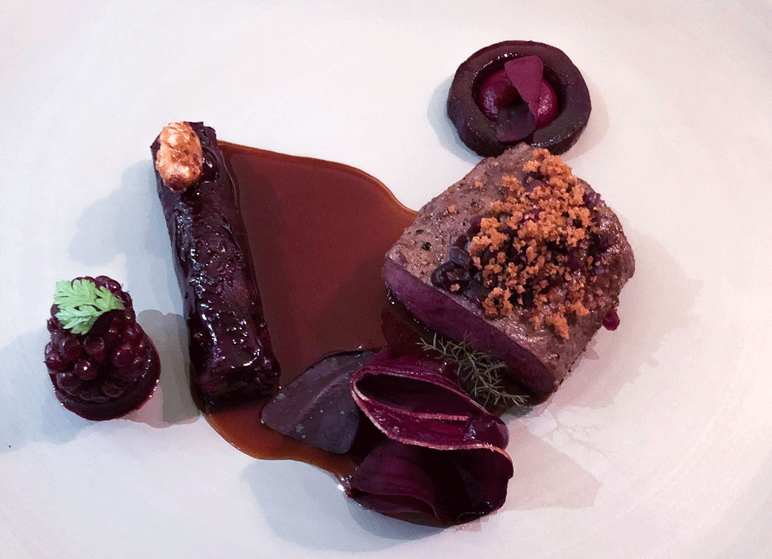 Harzer Rehrücken mit roten Randen, Brombeere und geschmortem Schäufelchen