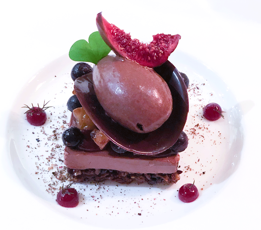 Die Milchschokoladenganache wurde mit etwas Pfeffer aufgepeppt. Eingelegte Feigen und gefrorene Cassisbeeren fügen sich harmonisch ein. Ein hervorragendes Dessert.