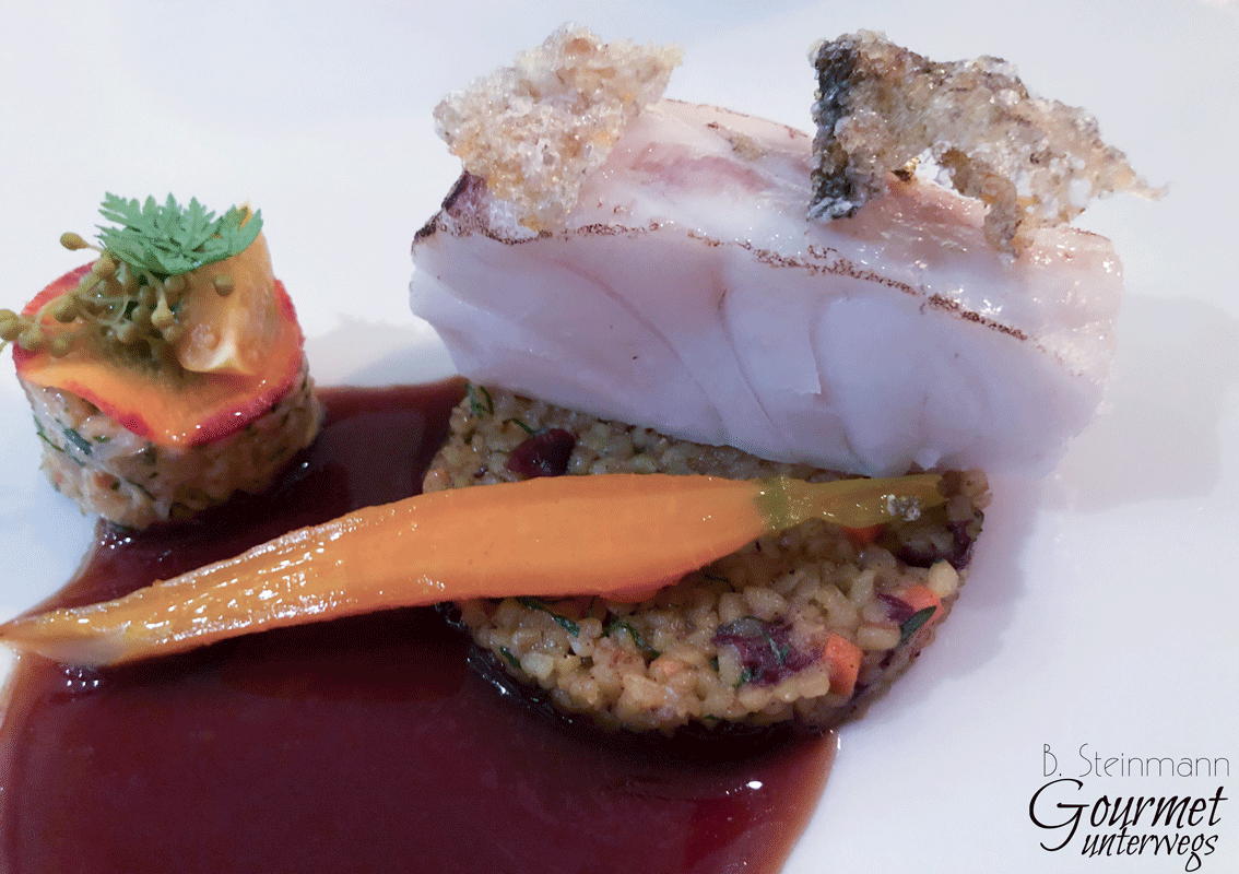 Der Zander wurde gedämpft und kurz geflämmt. Dazu wurde Couscous mit Cranberry und viel Petersilie gereicht. Ein Taschenkrebssalat mit Zitrone, sauer eingelegter Holunderblüte und Kräuter sowie eine fabelhafte Krustentierjus rundeten das Gericht ab.