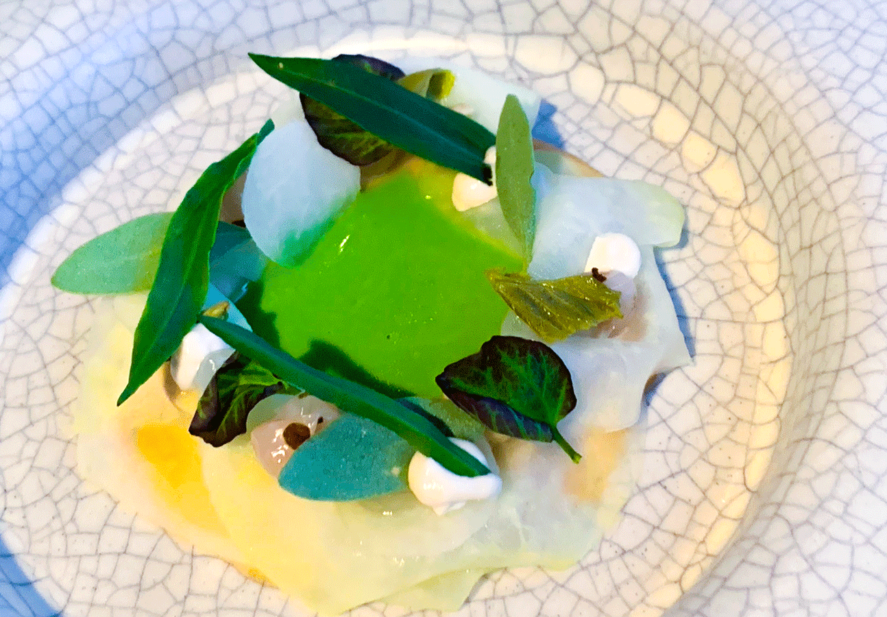 Wir erhalten Kohlrabi, welcher mit Kohlrabisaft mariniert wurde. Die beiden kleinen runden Scheiben (kann man diese erkennen?) wurden in Milchsäure vergoren. Hinzu kommt eine Austernemulsioncreme und Gel von Kohlrabi, Wasserkresse, eingelegte Buchenstiele (?), Salzlake und eine grandiose Vinaigrette aus Kräutern auf einer Meerrettichbasis.