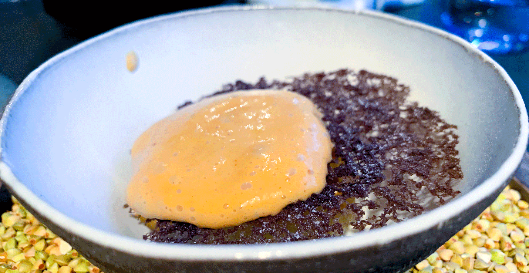 Eine schwarze Trüffelcreme peppt das Gericht auf und die gerösteten Haselnüsse sowie eine Haselnusscreme verfeinern das Ganze. Der Chip besteht, wenn ich das richtig verstanden habe, aus fermentiertem Brotmiso auf Basis eines Krustenbrotes.