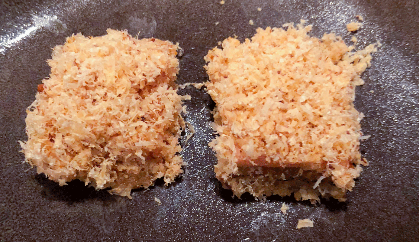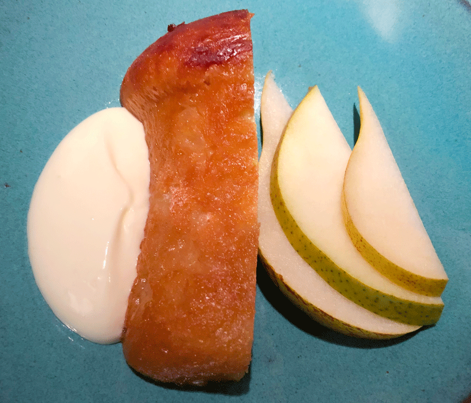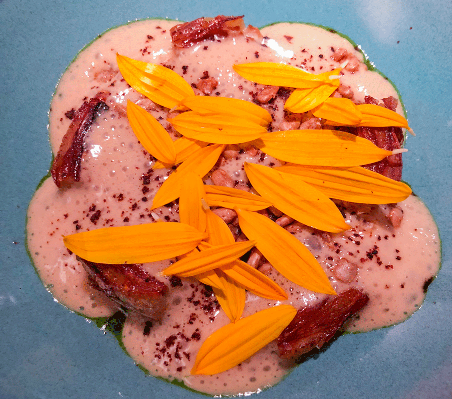 Eine gewöhnungsbedürftige Bezeichnung. Es handelt sich zunächst um den Rücken vom Mangalicawollschwein, der sechs Monate trocken reifte und bei 400 Grad mit dem Bunzenbrenner abgeflämmt wurde. Hinzu kommt eine Apfelscheibe eines namenlosen Apfels, der pinkfarben und recht säuerlich ist.