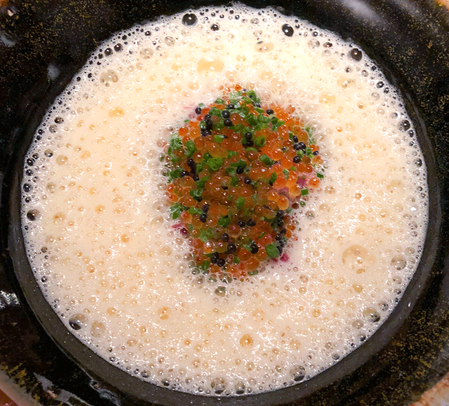 Konserviertes Gänseeisbein in einer Beurre blanc und Forellenkaviar. Ein durchaus deftiges Gericht. Kräftig und intensiv im Geschmack.