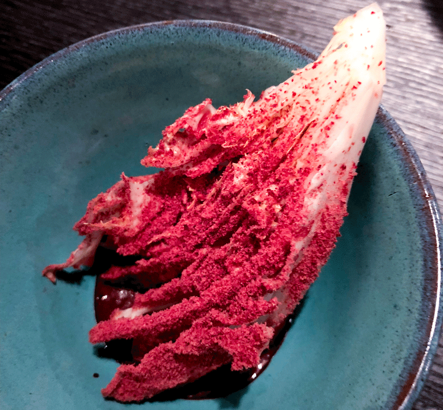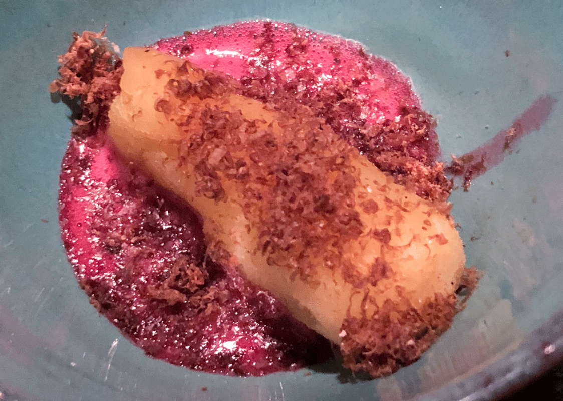 Das nenne ich mal einen kreativen Einfall. Schweineblut und Leber werden als Sauce gebunden. Angereichert mit Himbeeressig und pulverisierten Himbeeren.
