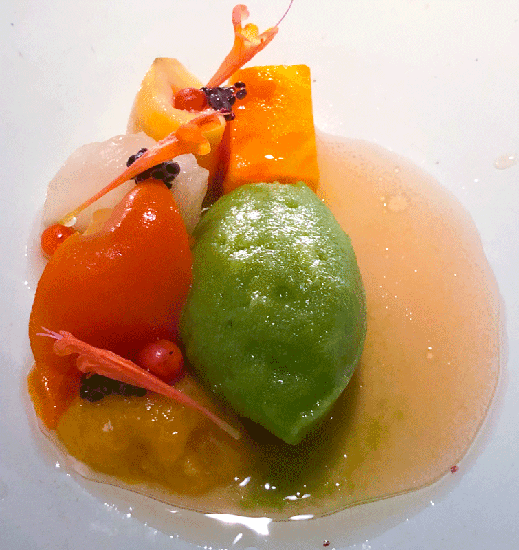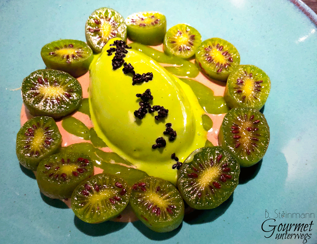 Kleine Kiwibeeren, die an Stachelbeeren erinnern. Der Bezug zur Region besteht darin, dass die Kiwifrucht vor Ort angebaut wird. Die Früchte werden mit Kürbiskernöl und Petersilieneis serviert.