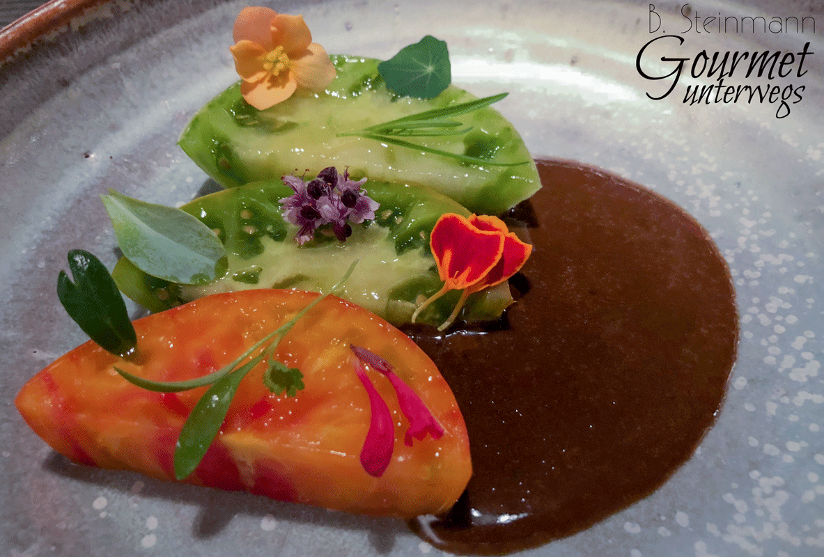Auf dem Teller finden wir eine „Greenshine Tomate“, eine „Evergreen Tomate“ und eine „Big Jumbo Tomate“. Ob die Blüten und Kräuter allesamt für den Geschmack notwendig sind, glaube ich nicht. Es gehört aber zur Stilistik der Kreation, Farbtupfer zu setzen. Begonienblüten, Kapuzinerblüten und Kräuter ergänzen das Gericht.