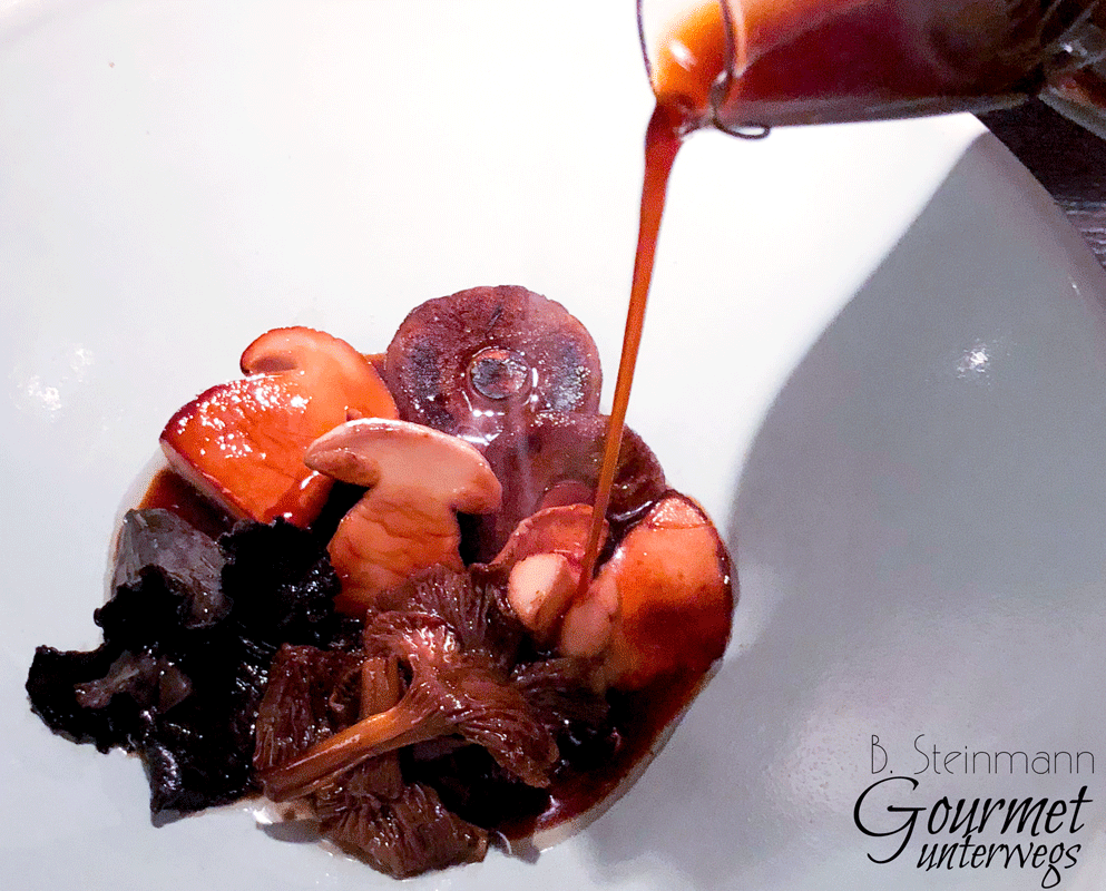 Pilze, Brühe, Douglasie, Rinderconsommee mit Steinpilzen und Maronen. Getrocknete und frische Pilze aus der Oberpfalz. Dabei handelt es sich um Totentrompeten und einen Semmel-Stoppelpilz.