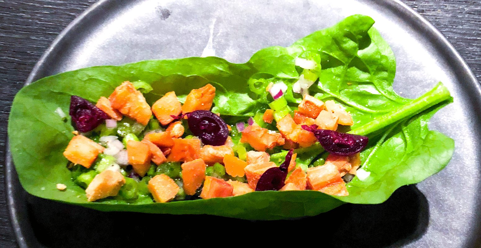Spinatblatt mit Croutons, hergestellt aus einem Schwefelporling, Jostabeeren und Schnittlauch.