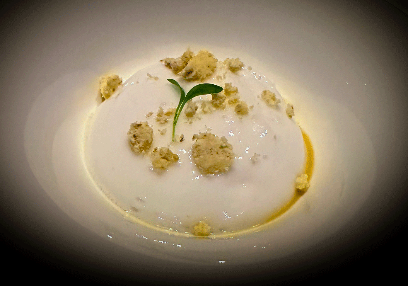 Ananassalat mit Raffaellocrumble und Kokosschaum als Vordessert.