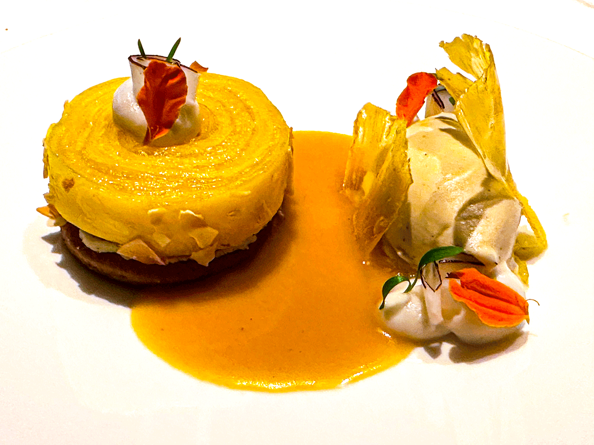 Tartelette mit karamellisierter Ananas, Tahiti-Vanille-Rumeis, junge Kokosnuss, Karamell-Bananensauce