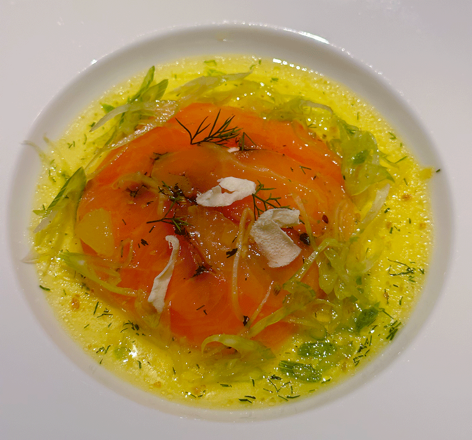 Panta rhei, wusste schon der alte Heraklit. Alles fließt. In Epfenhausen bei Landsberg fließt auch alles und zwar bei der Fischzucht von Nikolai Birnbaum. Von dort kommt der hervorragende Saibling, dessen Filet roh mariniert und geräuchert vor uns liegt. Ferner erkennen wir Crème fraîche und eine Vinaigrette mit Bergamotte sowie karamellisierter Fenchelsaat.