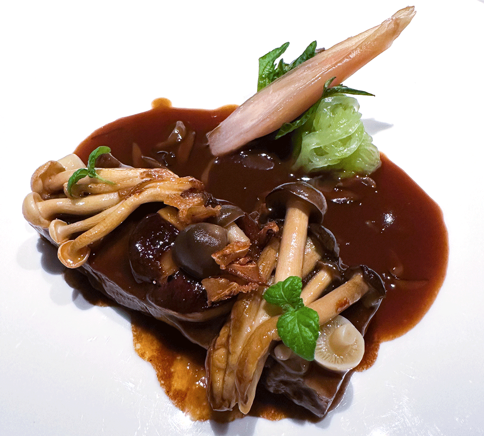 Geschmortes Short Rib vom Bayrischen Wagyu, gepickelte Myogawurzel, Aubergine, Shiitakejus, grüne Shiso
