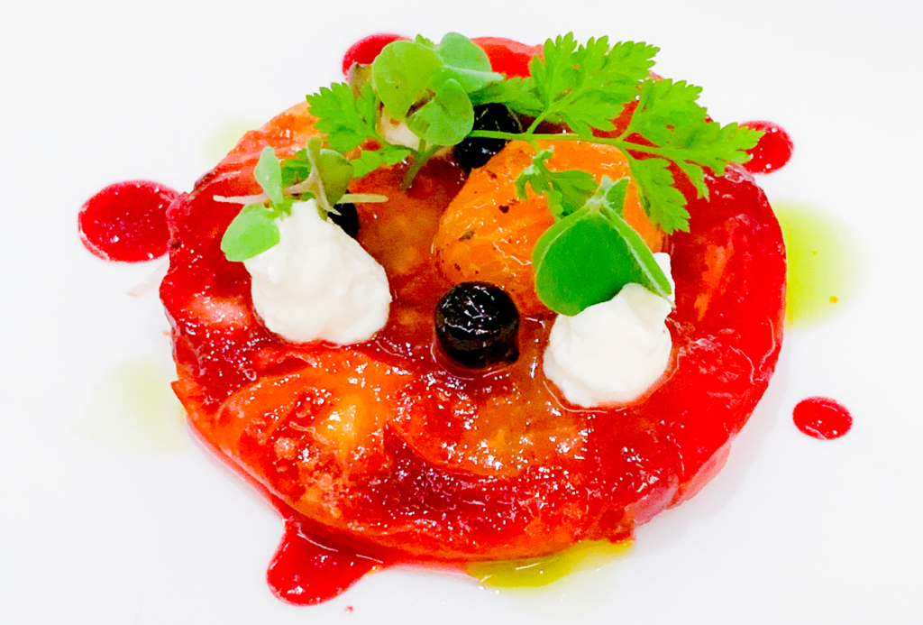 Tomate, Basilikum, schwarze Johannisbeere und eine hauchdünne Teigplatte
