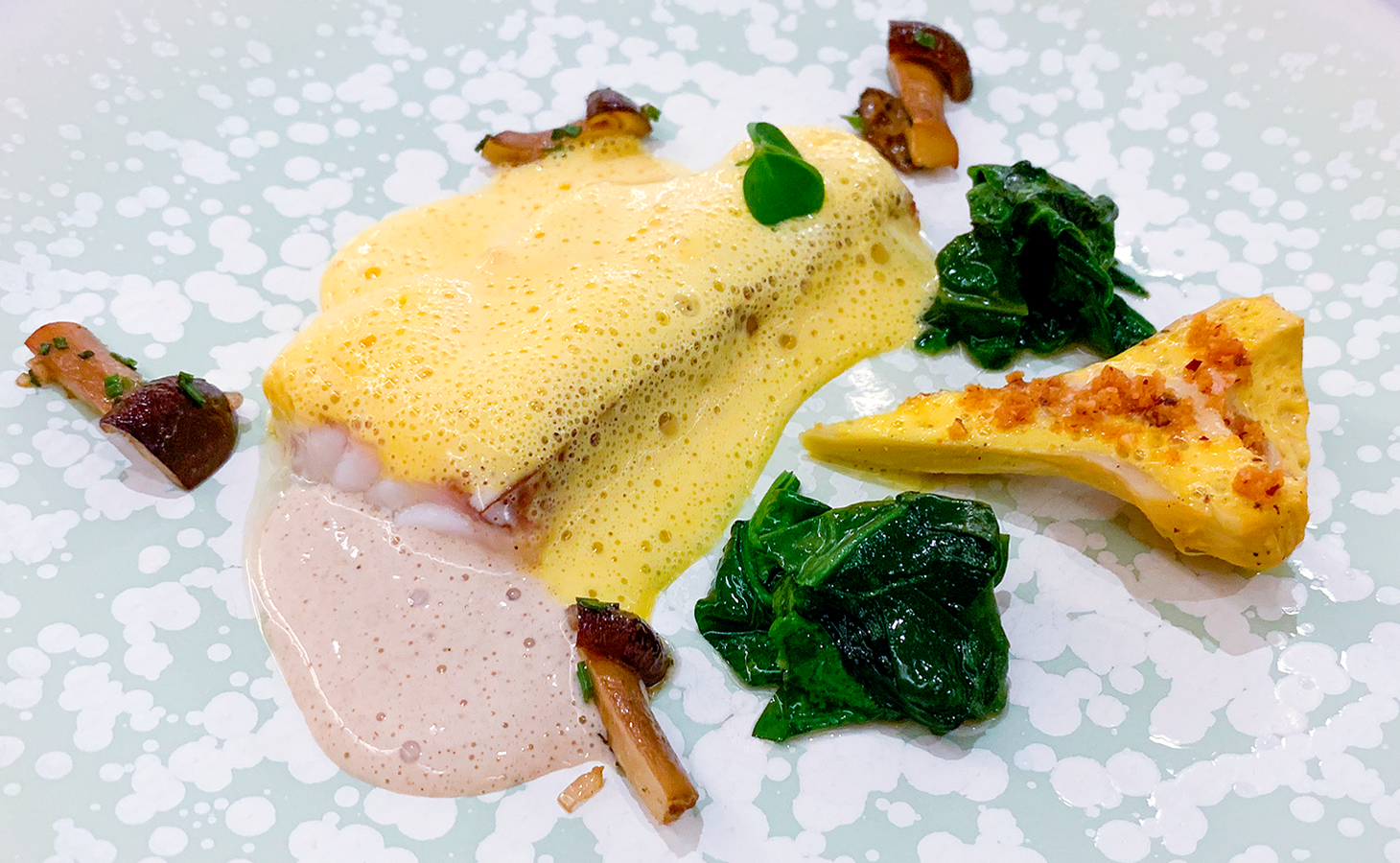 Spinat, Kaninchen, Wachtelei in Burgundersauce