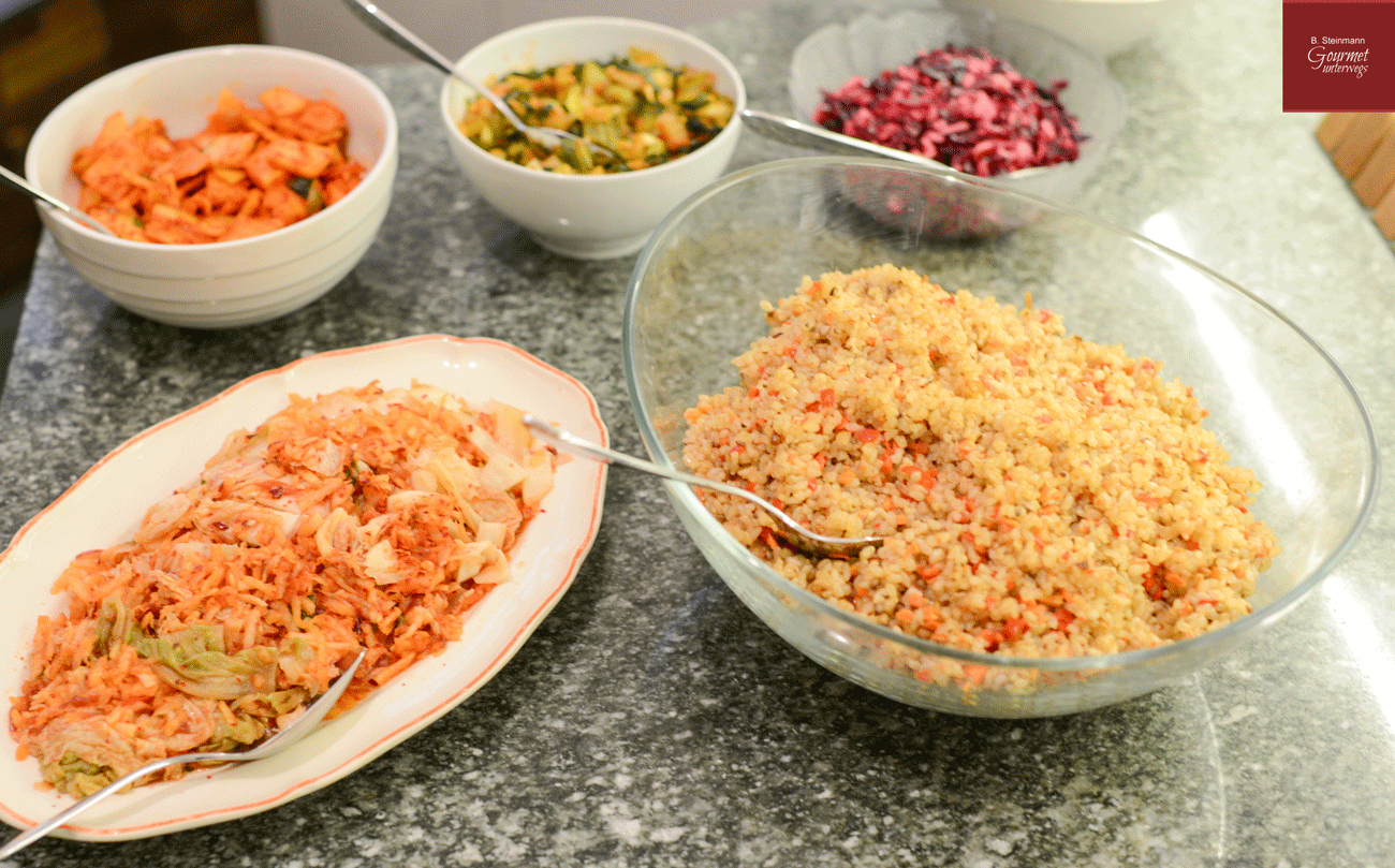 Nun ist koreanisches Essen nicht gerade meine Kernkompetenz. Allerdings weiß ich, dass sich viel um Kimchi dreht. Kimchi ist in der koreanischen Küche die Zubereitung von Gemüse durch Milchsäuregärung. Und damit bin ich auch schon mit meinem Latein am Ende.