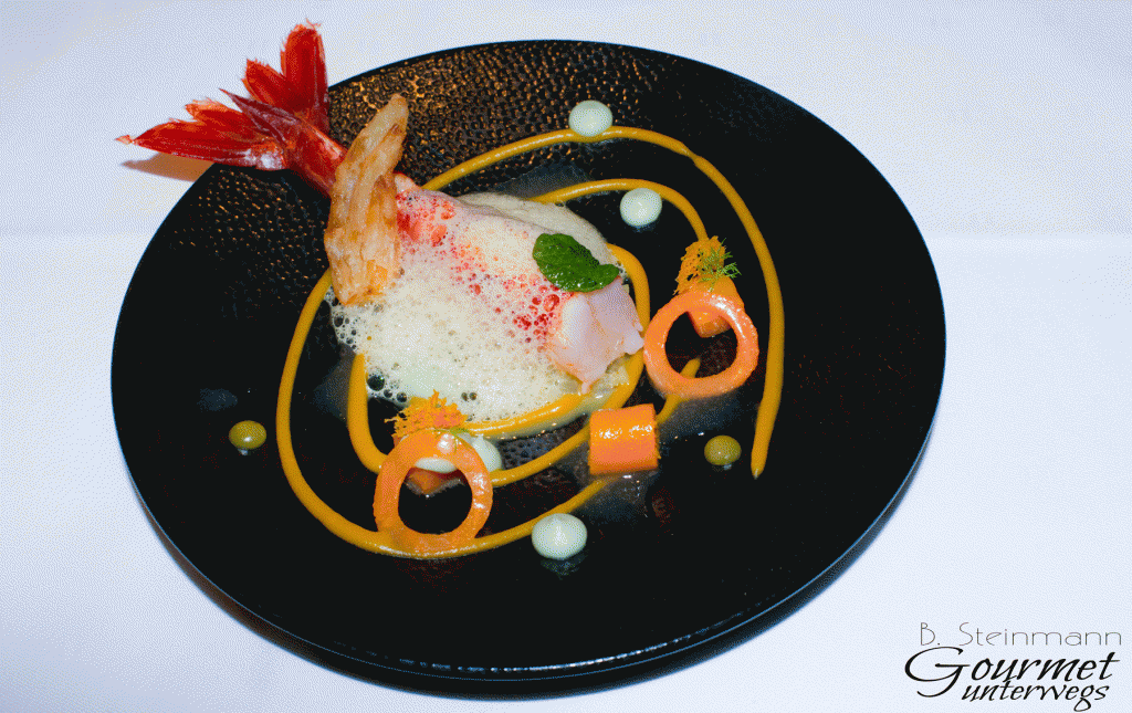 Gegrillter Atlantik-Carabinero mit einer Liaison von Süßkartoffel, Orange und Anisjus