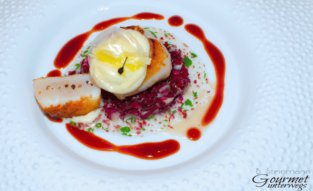 St. Jakobsmuschel aus Dieppe mit sautiertem Radicchio, Boskop-Apfel und Heuaromen.