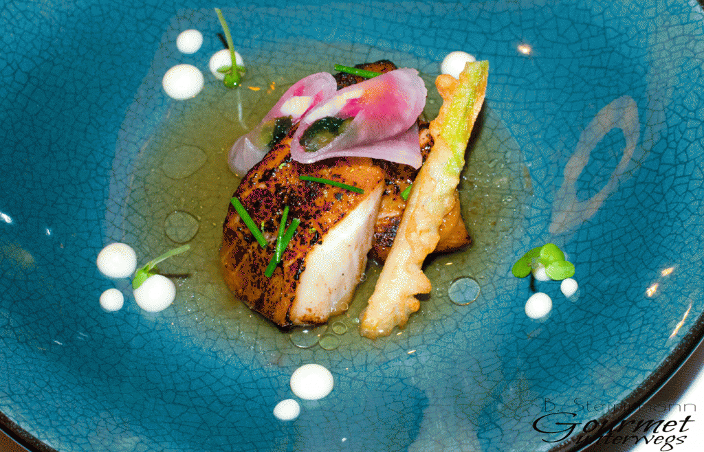 Ein elegantes Fischgericht, würzig mit kräftigen Aromen. Die Mandelcreme hat uns dabei besonders gut gefallen, ebenso der mit Kokosöl verfeinerte Ingwersud.