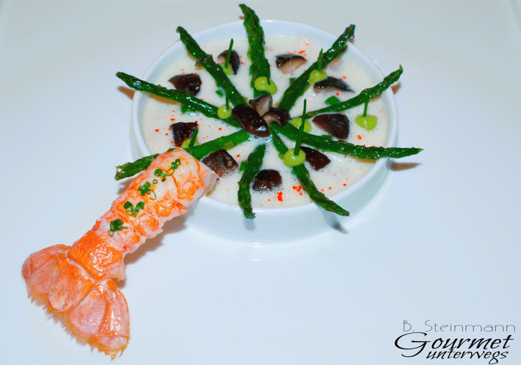 Die Kreation sieht toll aus. Wow, ist der erste Eindruck. Geschmacklich ist dieses Gericht ein Volltreffer. Ein breites, vollmundiges Aromenbild, ohne Wucht, viel Leichtigkeit, knackigem Spargel, eigentlich sehen wir hier nur Hauptdarsteller, keine Komparsen.