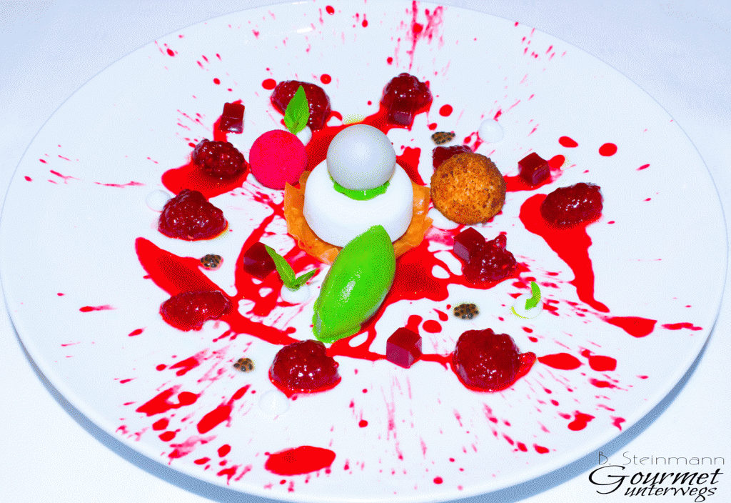 Köstliches Dessert und wuchtiges Tellergemälde.
