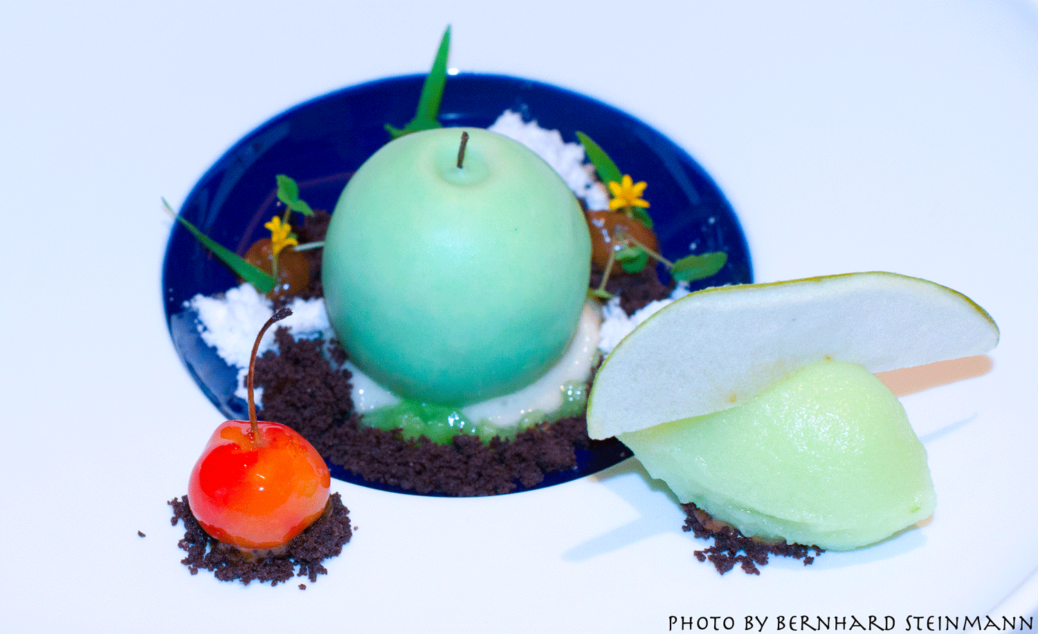 „Zwei Äpfel fielen weit vom Stamm“ mit Macadamiacreme, Kaffeeessigschaum und Granny Smith Sorbet