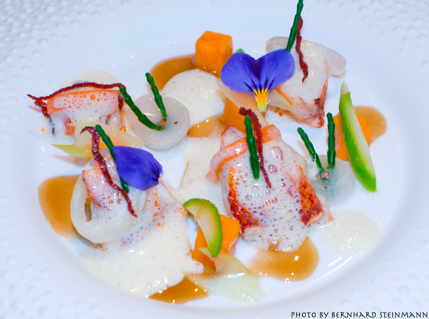 Frikassee vom gegrillten Hummer mit gebrannter Litschi, Madagaskar-Pfefferjus und knusprigem Bündnerfleisch