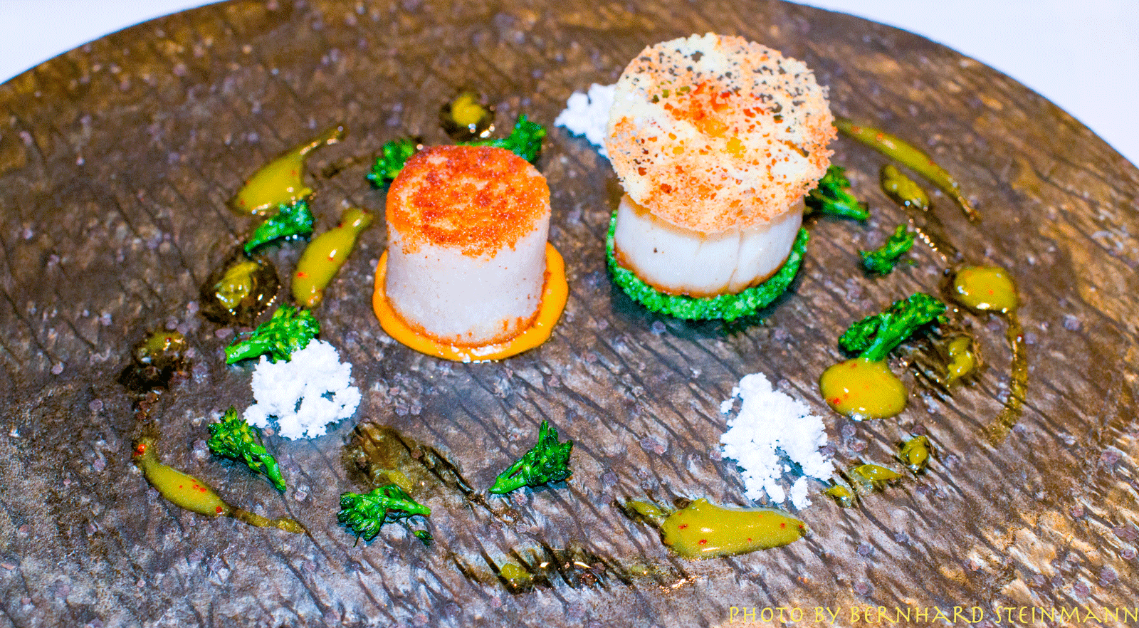 In Kardamom gebratene St.Jakobsmuschel aus Dieppe mit wildem Brokkoli, Tomate und Mandarine