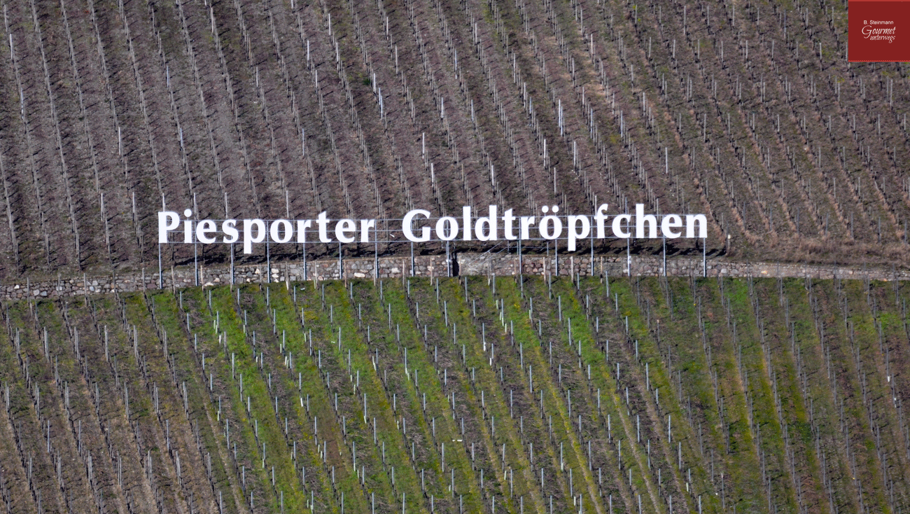 Auf der linken Moselseite erstreckt sich die 66 Hektar große Weinlage des bekannten Piesporter Goldtröpfchens. Auf dem Schieferboden gedeiht ein vortrefflicher Riesling.