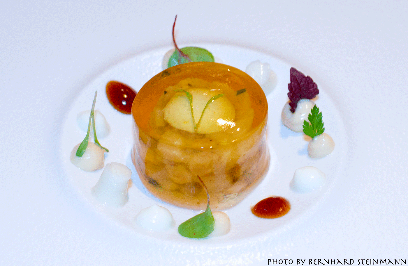 Carpaccio von der Gänsestopfleber mit eingedicktem Traubenmost, Sherrygelee und Parmigiano Reggiano