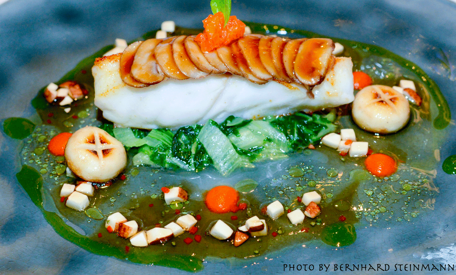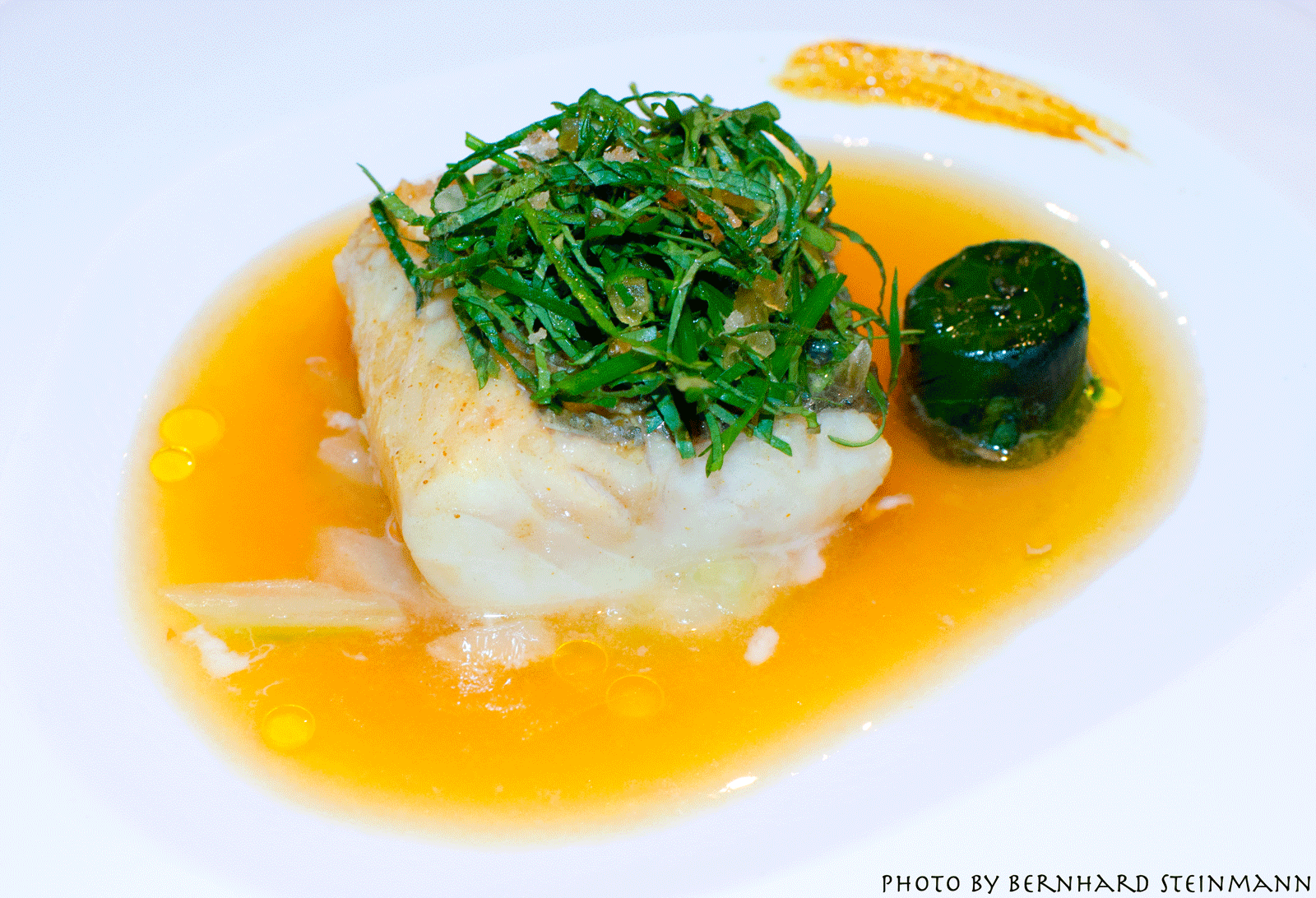 Es ist kaum zu glauben, doch das bis hierhin schon hervorragende Menü erfährt eine weitere Steigerung. Es mag puristisch aussehen, doch der Aufwand für dieses Gericht ist enorm. Der grandios zubereitete Fisch mit karibischem Flair begeistert uns restlos. Der Gewürzsud ist von kräftigem und aromatischem Geschmack und fein ausbalanciert.