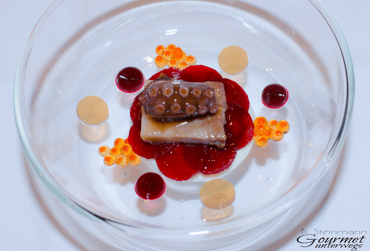 Glasierter Schweinebauch mit Octopus und Rote Bete, Cidregelée und Forellenkaviar.