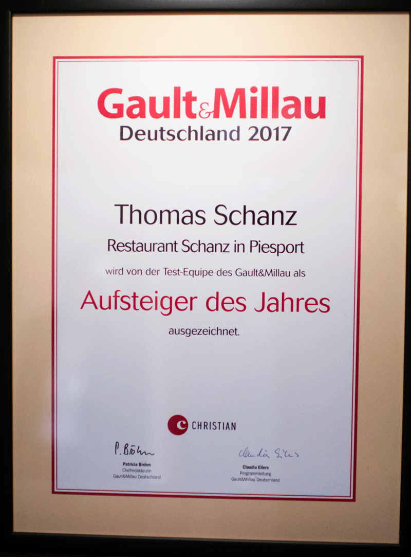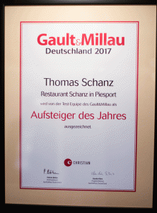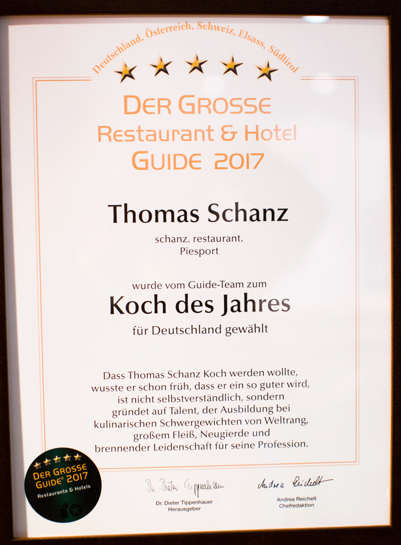 Der „Grosse Restaurant & Hotelguide 2017“ zeichnete den begabten Küchenchef als „Koch des Jahres“ aus. Die, meiner Meinung nach, noch bedeutendere Auszeichnung kam von der Test-Equipe des Gault&Millau Deutschland, die das Restaurant Schanz als „Aufsteiger des Jahres“ auszeichneten. Damit folgt er so bekannten Köchen wie z. B. Tim Raue (2005), Sven Elverfeld (2002) oder Thomas Bühner (2001).