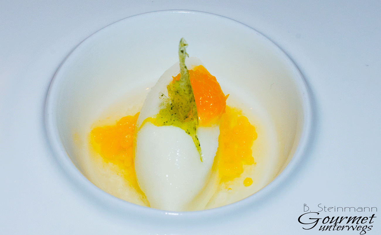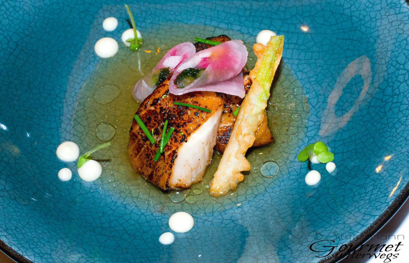 Ein elegantes Fischgericht, würzig mit kräftigen Aromen. Die Mandelcreme hat uns dabei besonders gut gefallen, ebenso der mit Kokosöl verfeinerte Ingwersud.