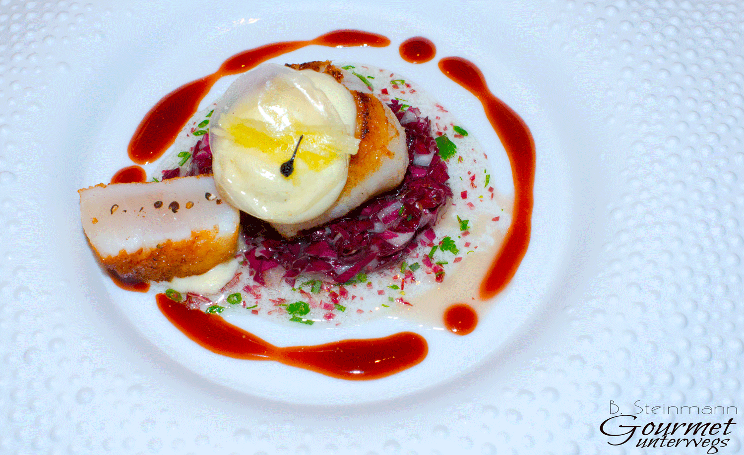 St. Jakobsmuschel aus Dieppe mit sautiertem Radicchio, Boskop-Apfel und Heuaromen.