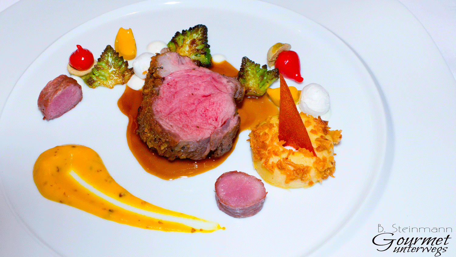 Das Lamm begeistert uns auf zweierlei Art. Erst einmal als Produkt, tolles Fleisch, sehr gut zubereitet und zweitens als Teil einer gelungenen Präsentation, bei der die Begleiter mit Bedacht ausgewählt wurden.