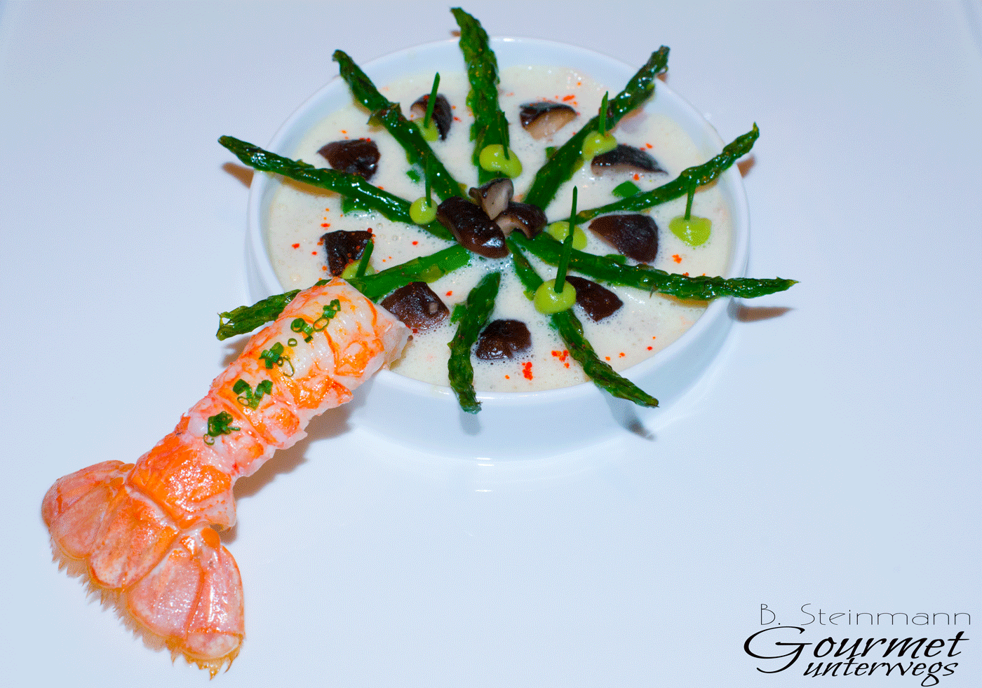 Die Kreation sieht toll aus. Wow, ist der erste Eindruck. Geschmacklich ist dieses Gericht ein Volltreffer. Ein breites, vollmundiges Aromenbild, ohne Wucht, viel Leichtigkeit, knackigem Spargel, eigentlich sehen wir hier nur Hauptdarsteller, keine Komparsen.