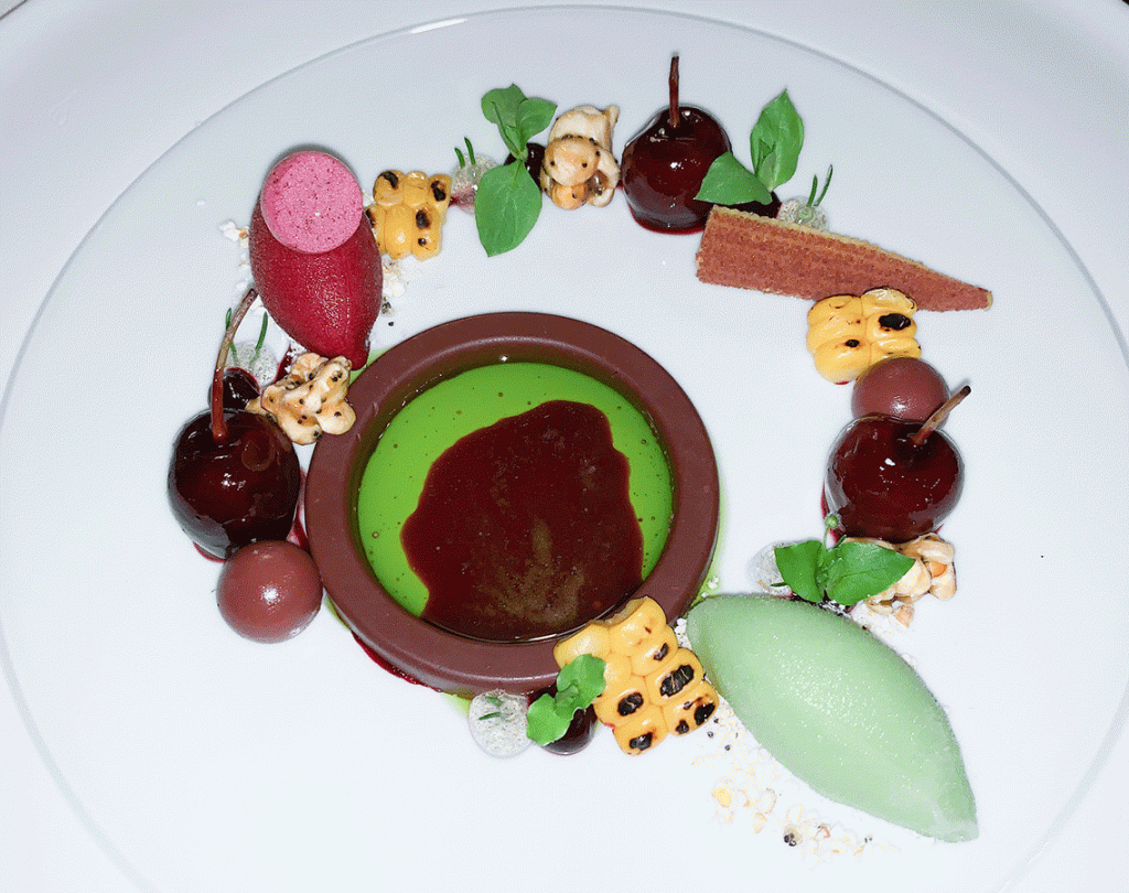 Dementsprechend kommt die schwarze Kirsche in Begleitung einer köstlichen Bitterschokolade auf den Teller. Die rund 70%ige Schokolade ist weit von dem Begriff Süßigkeit entfernt.