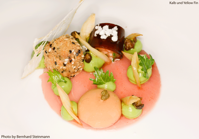 Links oben finden wir Thunfisch, Rübstiel und Kapernbeeren in einem mit schwarzem Sesam gespicktem Würfel. Das Ganze ruht auf einer hauchdünnen Kalbfleischscheibe.