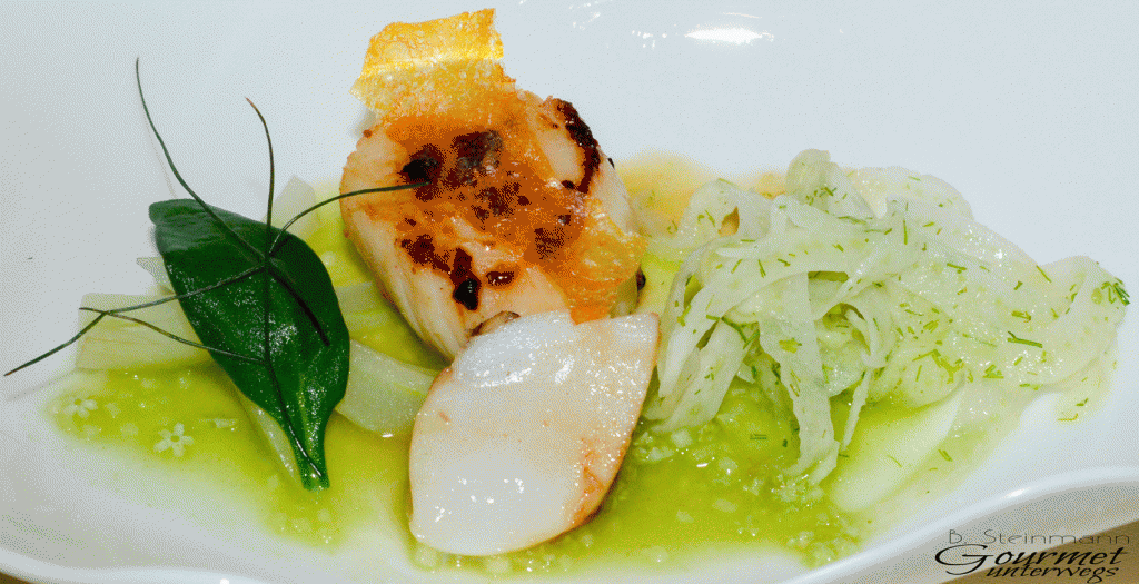 Die Jakobsmuschel ist von sehr guter Qualität und findet im Fenchel eine traditionelle Begleitung. Ein Sonderlob gibt es für die Kräuter-Zitrus-Emulsion mit überaus dezenten Säurenoten.