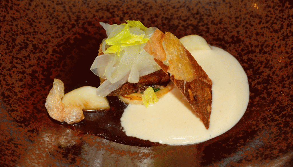 Sellerie als Würzbasis ist ein gerne eingesetztes Gemüse. Auch in diesem Gericht übernimmt es eine tragende Rolle, ohne Kalbsbries und Kalbskopf in wirkungsarme Nebenrollen zu drängen.