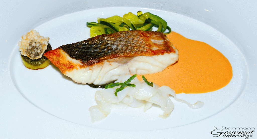 Wolfsbarsch mit eingelegter Zucchini, Sepia und Sauce Choron